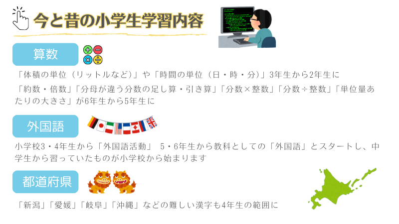 お母さんの時代、勉強が難しくなったのって5年生からじゃなかったですか?と言われて、そのイメージですね!と話すと、今の子供は1学年勉強が降りてきてると思ってください。これ見てくださいと表を見せられました。