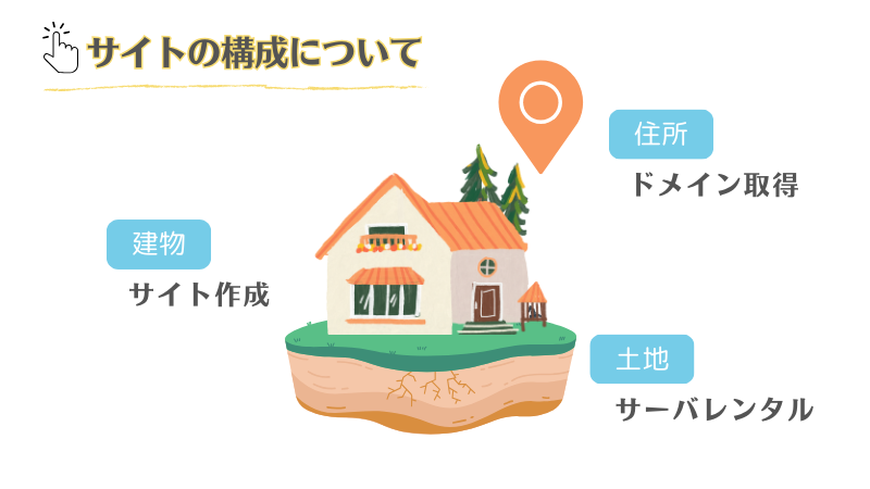 今やっとサーバーを借りて(土地契約)サイトURLを決めて(住所決定)Wordpressでサイトを作り始めた(家を建てる)ところだと思います。