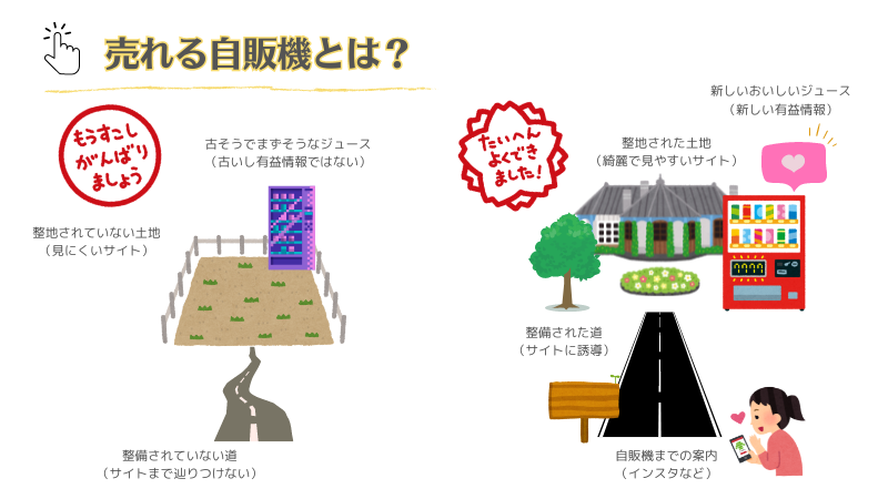 まずきったないボロボロの家ではどんなにいい自販機でも見栄えも悪いし、買う気になれませんよね?とりあえず最初に出来ることはサイトをキレイにしていくこと!ここの情報なら信じられる!という概念をもってもらうことです。